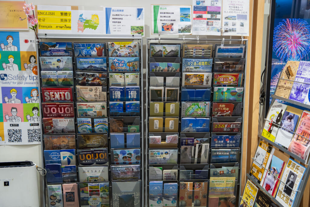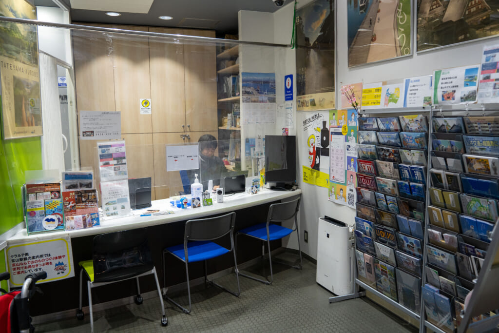 | 備考 | 主なサービス内容 ・富山県内の観光情報の提供 ・市内電車・バス 1日フリーきっぷの販売 ・ぐるっとグルメぐりクーポン販売 ・観光タクシーの手配 ・シェアサイクル「アヴィレ」1日パス申込書 ・Free WiFi 有り ・外貨両替機「SMART EXCHANGE」設置 |