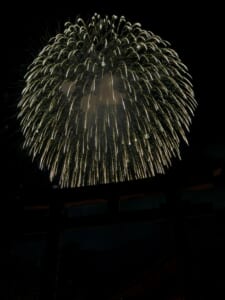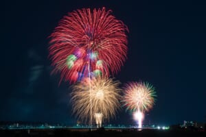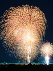 色とりどりのスターマインや尺玉が夜空に大きく広がり、