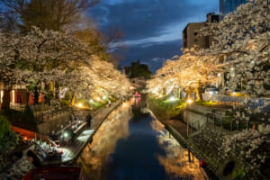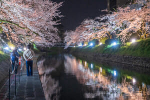 夕暮れから夜にかけては桜のライトアップが行われ、水面に映り込む花景色が幻想的な雰囲気を演出します。