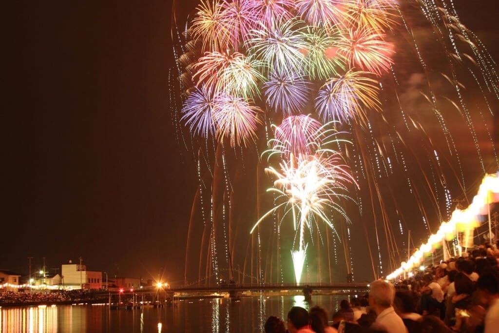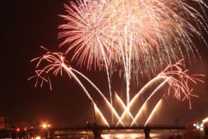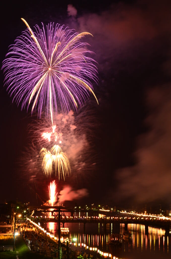 スターマインや水中花火が次々と打ち上がり、川面に映る光が揺れて、思わず息をのむほど幻想的なひとときに。