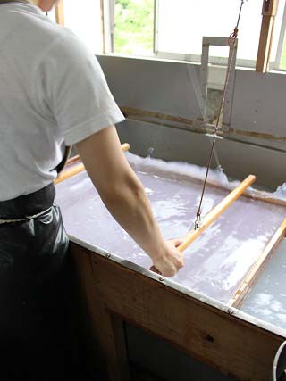 木枠ですくい上げた紙のしずくが、均一に揺れて、すっと一枚に変わっていく瞬間はちょっと感動です。