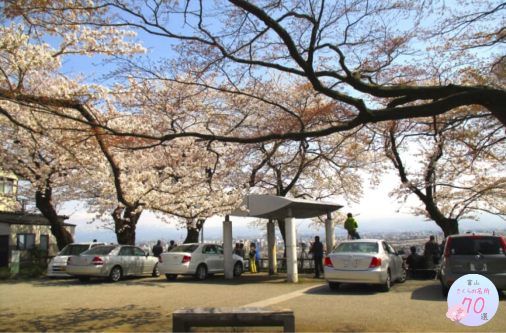 呉羽山は標高80mで市の西部に位置し、山頂を中心に一帯が公園として整備されています。展望台からは、残雪の映える立山連峰を背景に市内を一望できる素晴らしい眺めを楽しめます。民俗民芸村周辺から道に沿って豊栄稲荷神社周辺まで桜並木が続きます。
