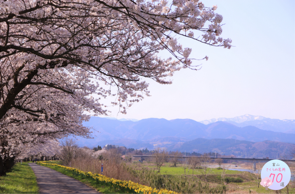 神通川の中州にある西神通・中神通は、周囲を堤防に囲まれた輪中地域で、4.8キロの回廊に800本もの桜並木が続く『神通川さくら堤』と呼ばれています。また、『塩の千本桜』は、富山県の真ん中を流れる神通川の右岸、富山市塩に植えられた約1キロ、200本のさくら堤。「塩」という地名の由来は、昔の伝説で「この近くの池から良い塩がとれる」という神のお告げがあり、その通りに良い塩が見つかったことからとのことです。水仙と桜のコラボレーションが楽しめるスポットです。