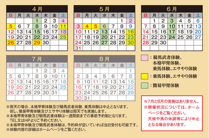 本格甲冑のほかにも、気軽に楽しめる簡易甲冑や着物体験、乗馬体験、馬のエサやり体験もご用意。