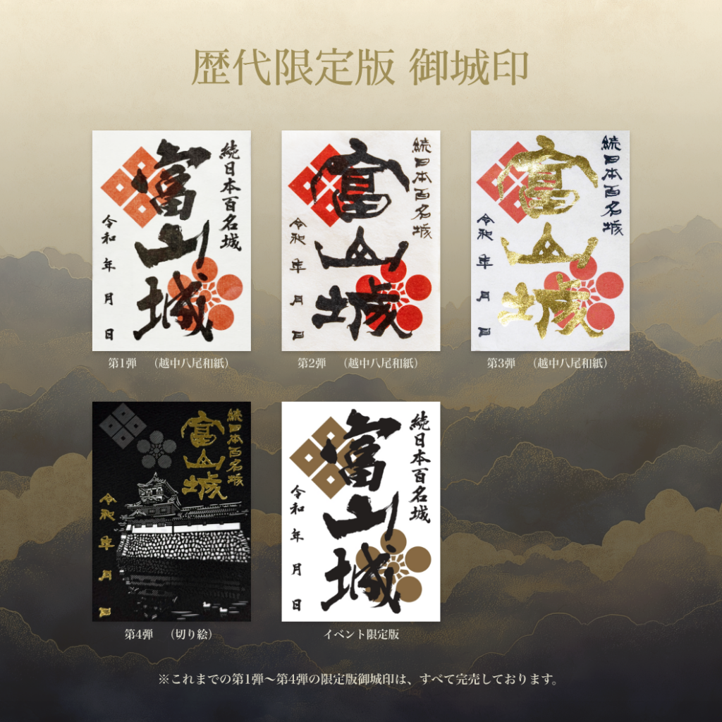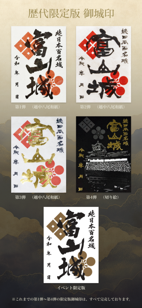 城名を力強く配し、歴代城主の歴史を感じさせる意匠により、富山城の歩みと格式を表現しています。