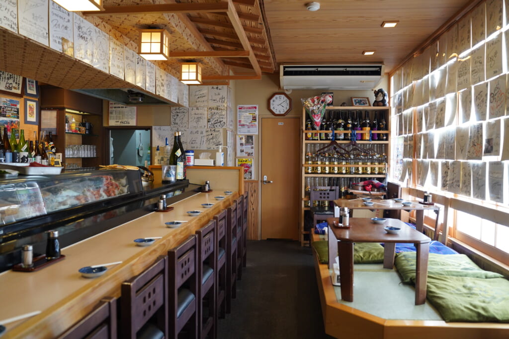 新鮮な朝獲れ魚介が並ぶネタケース越しに店主との会話を楽しめるカウンター席で、趣も一緒に味えます。