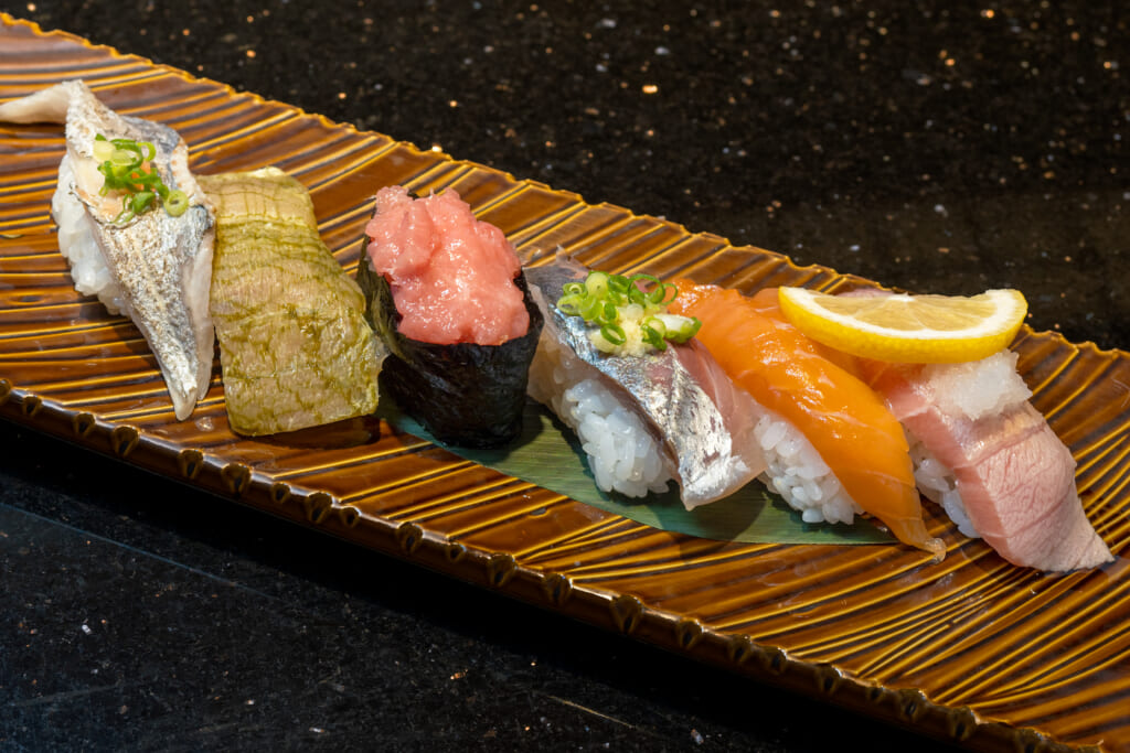 氷見を筆頭に、魚津、黒部、金沢から調達する旬の魚を、井戸水で炊く黒部産コシヒカリのシャリと重ねた「飯野店」ならではの一貫とオリジナルメニューを求め、県内外からファンが訪れます。