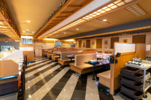 タッチパネルでのオーダーから職人が即座に握る寿司は、カウンター席、4人・6人掛けのテーブル席、8人掛けのテーブル席へと繋がるレールに乗り、最高鮮度で直送。