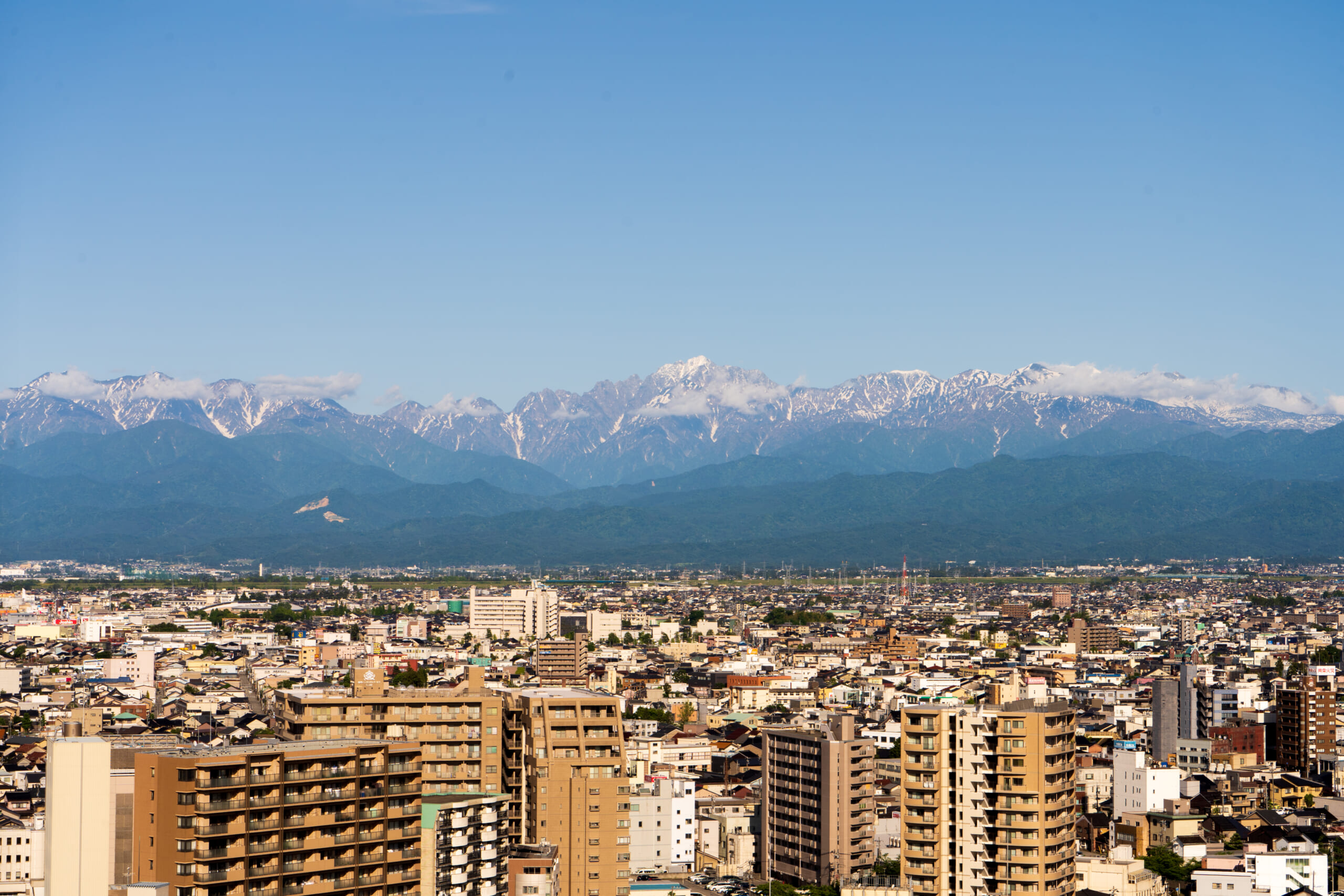雪が少し残る立山連峰と、新緑に色づく街のコントラストが美しい季節です。
