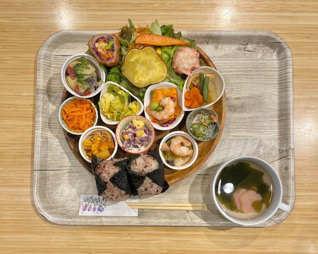 また店内は、奥に坪庭がある落ち着いたつくり。2階では野菜多めの“からだ想い”ランチも楽しめるので、おみやげ選びのついでにひと休みするのにもぴったりです。