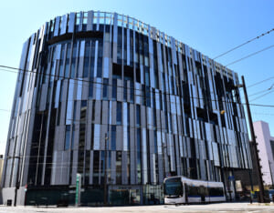 富山駅(南口)から「環状線(セントラム)」に乗車(約14分) →「グランドプラザ前」電停で下車、徒歩約2分
