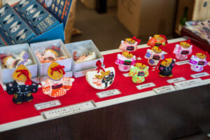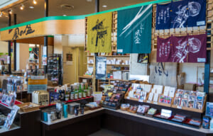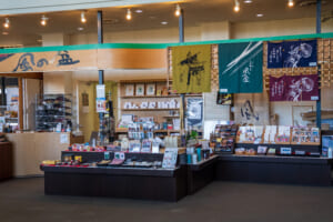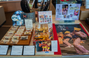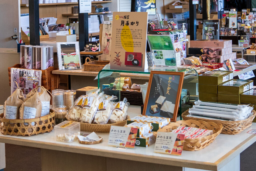 売店には、DVD・CDをはじめ、ポストカードやてぬぐいなど、おわらや曳山をテーマにしたグッズや八尾の特産品がずらり。
