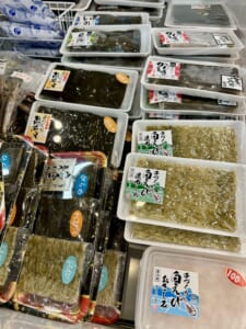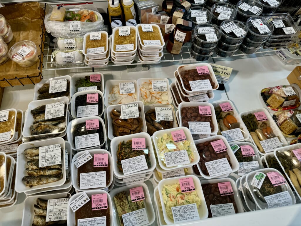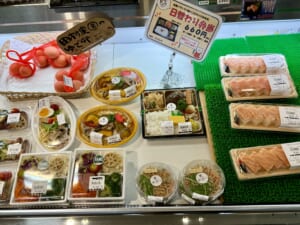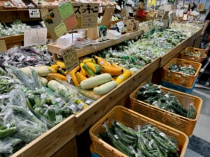 店内には、朝採れの野菜や旬の果物をはじめ、手づくりのお弁当や惣菜、山菜、加工品、地酒までずらり。