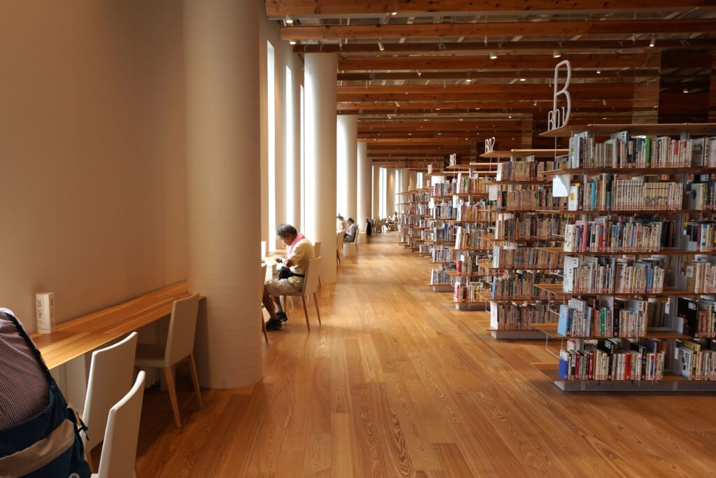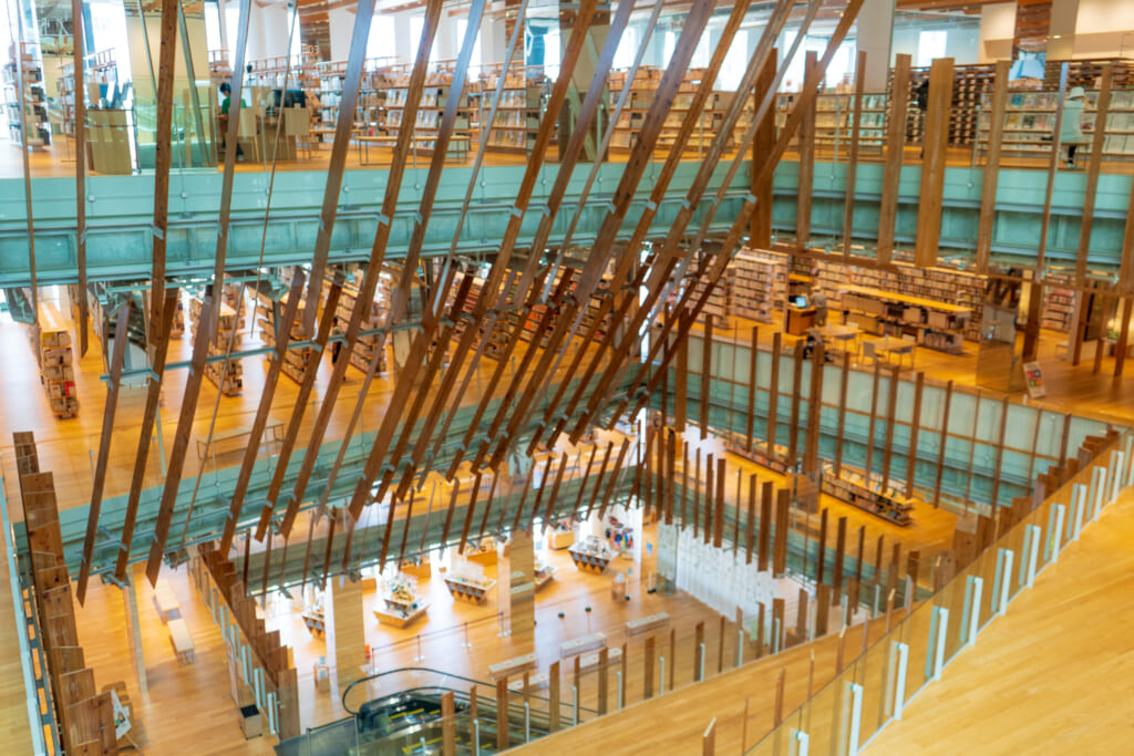 富山市中心部の複合施設「TOYAMAキラリ」にある富山市立図書館は、世界的建築家・隈研吾氏が設計した木質の温もりあふれる空間が特徴。
