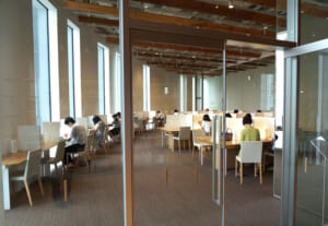 館内には気分で選べる多彩な閲覧席があり、とくに北側の窓際席は、天気がよければ立山連峰や路面電車、まちなかの風景をゆったり眺められる“特等席”。