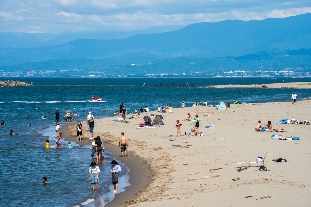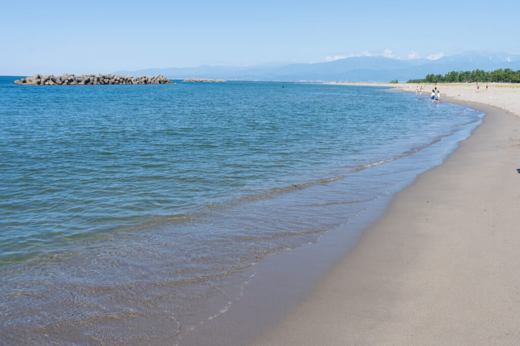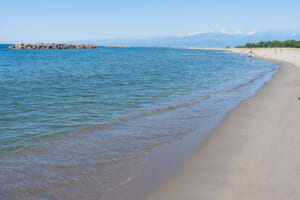 富山湾に面した「岩瀬浜海水浴場」は、青く広がる海の向こうに立山連峰を望む、全国でもめずらしい景色が魅力のビーチ。