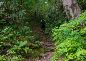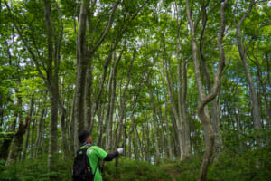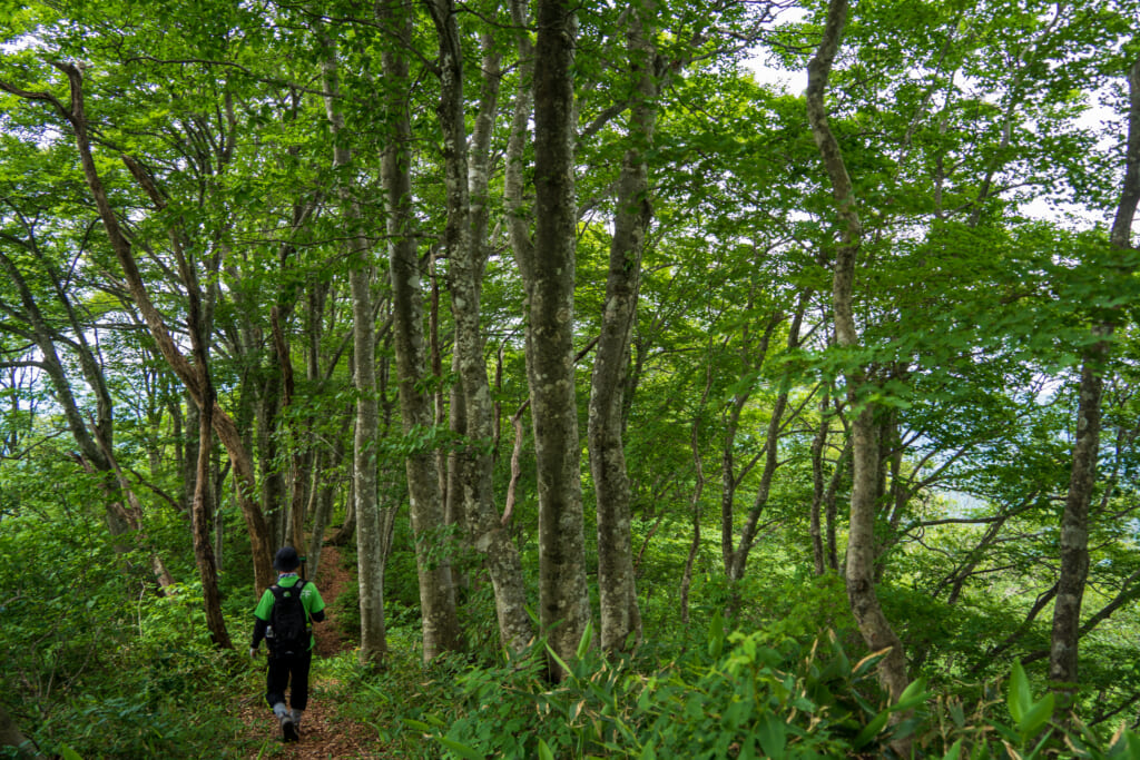 8合目付近に広がる「鍋谷のブナ林」は、背の高いブナが立ち並ぶ美しい森で、静けさに包まれる癒しの空間。