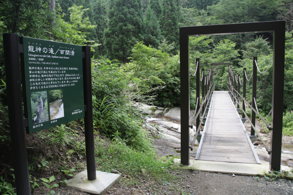 ゲレンデから続くトレッキングコースを歩くこと約30分、前方に吊り橋が見えてきたら、百間滑に到着です。