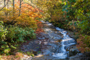 約200mの岩盤を清流が流れる〈百間滑〉は、自然がつくる“アートのような景観”