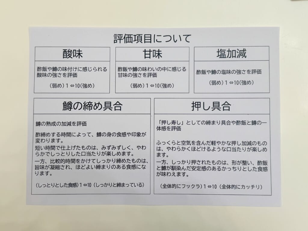 味の評価は5つの項目に分けられています。酸味の強弱、甘みの広がり、塩加減、酢による魚の締め具合、押し具合。これまで感覚的に語られてきた味わいを、数値により可視化していきます。