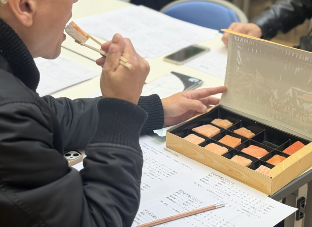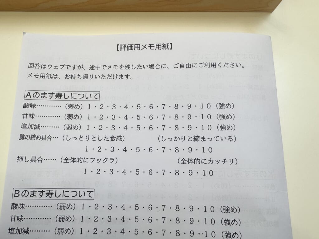 二口目は、評価項目を意識しながらパクリ。酢の強さはどのくらいか、甘みはどこで広がるのか。締めは強いのか、それともやわらかいのか…。頭の中でぐるぐると考えを巡らせながら、数字とにらめっこ。用紙の数字に丸をつけていきます。