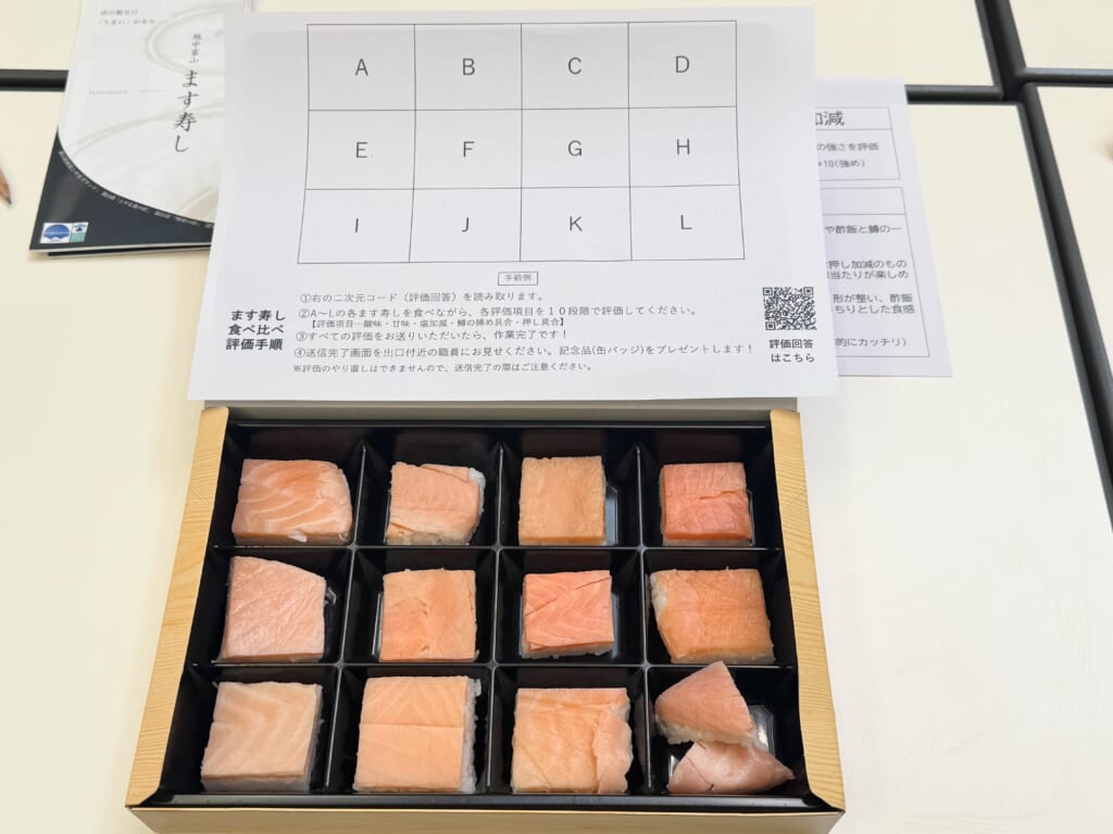 こちらが味比べセットです。一口大に切られた12個(12店舗分)のます寿しが並べられ、AからLまでのアルファベットで表記されています。店名を記載しないのは、先入観を持たず、味そのものと向き合うための工夫です。