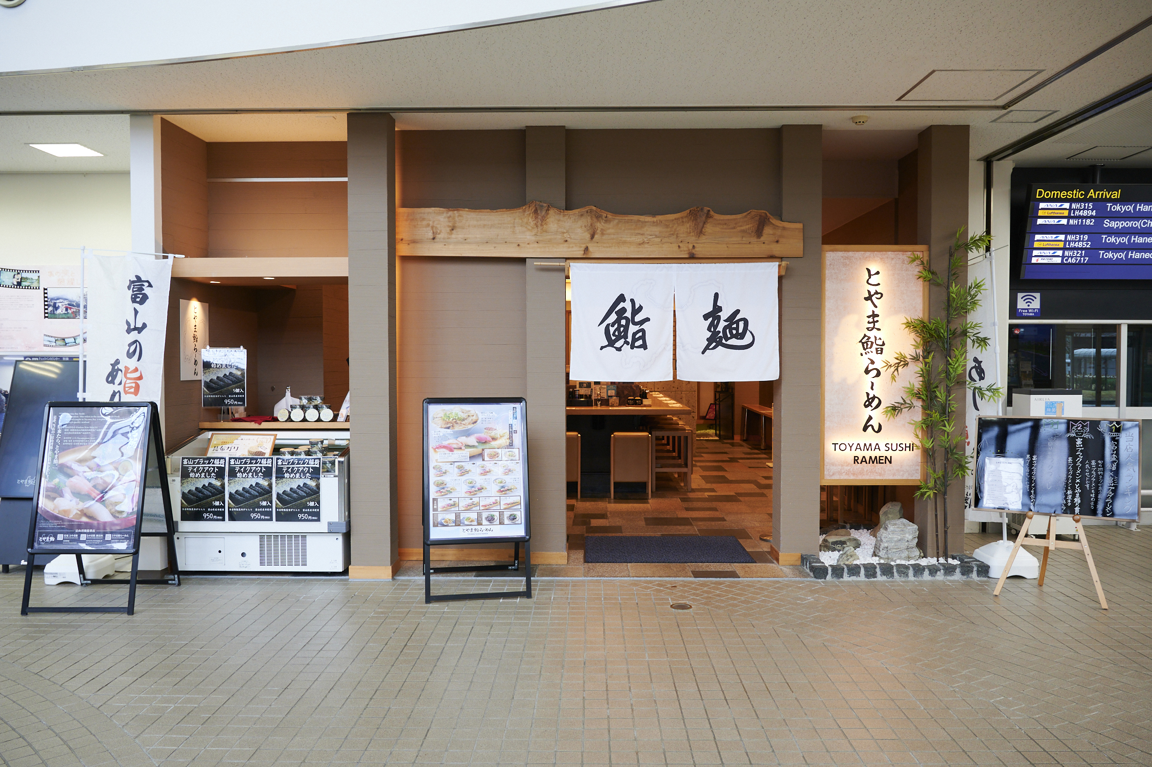 富山空港ターミナル内にある「とやま鮨らーめん」は、寿司とラーメンという二つの人気看板メニューで富山の味を伝える店だ。富山湾で水揚げされた新鮮な魚を握る寿司、そして濃い醤油スープが特徴の富山ブラックラーメンを提供し、地元ならではの味覚を気軽に楽しむことができる。出発前や到着後に立ち寄る客も多く、空港という場所で富山の食文化に触れられるのが魅力。店内には立山杉や越中和紙、高岡銅器など県内の素材や工芸も取り入れられており、空間からも富山らしさを感じられる。寿司と麺、ふたつの味わいを通して、この土地の食の奥行きを伝えてくれる一軒だ。
