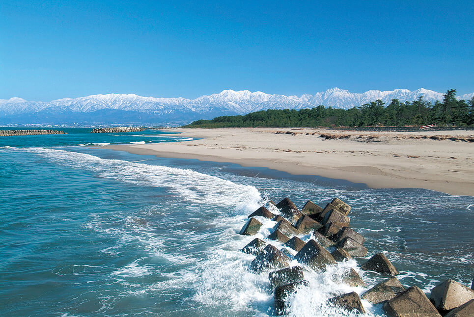 富山湾の向こうに立山連峰が眺められる場所です。
