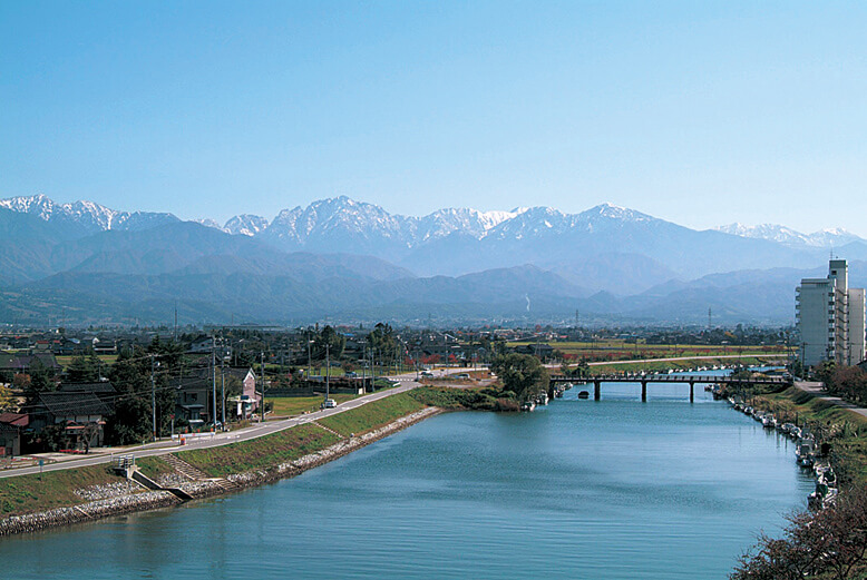 水橋商工文化会館周辺(白岩川左岸)は、川の流れと立山連峰がベストマッチする場所です。